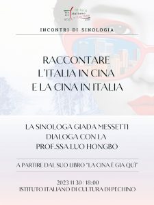 L’Istituto Italiano di Cultura è felice di annunciare l’organizzazione di un incontro di sinologia dal titolo “Raccontare l’Italia in Cina e la Cina in Italia”. L’evento vedrà la partecipazione della sinologa Giada Messetti e della Prof.ssa Luo Hongbo e si terrà il 30 novembre alle ore 18:00 presso la nostra sala. Giada Messetti, sinologa, saggista e […]