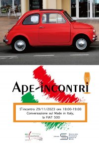 Siamo lieti di annunciare il quinto incontro di conversazione in italiano sulla cultura del Belpaese, aperto a chiunque abbia un livello di italiano equivalente almeno a B1. Inizia una serie di ape-incontri sul MadeinItaly, in questo appuntamento parleremo della FIAT 500. Ai partecipanti, che ricordiamo non potranno essere più di 15, verrà spedito del materiale […]