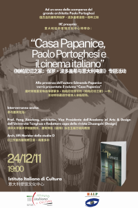 Il giorno 11 dicembre p.v. alle ore 19.00 si terrà presso l’Istituto Italiano di Cultura la presentazione del libro Casa Papanice, presente l’autore Edmondo Papanice – Presidente Associazione Halp. Interverranno, inoltre, il Prof. Fang Xiaofeng, architetto, Vice Presidente dell’Academy of Arts & Design dell’Università Tsinghua e Redattore capo della rivista Zhuangshi (Design), e l’Arch. Effi […]